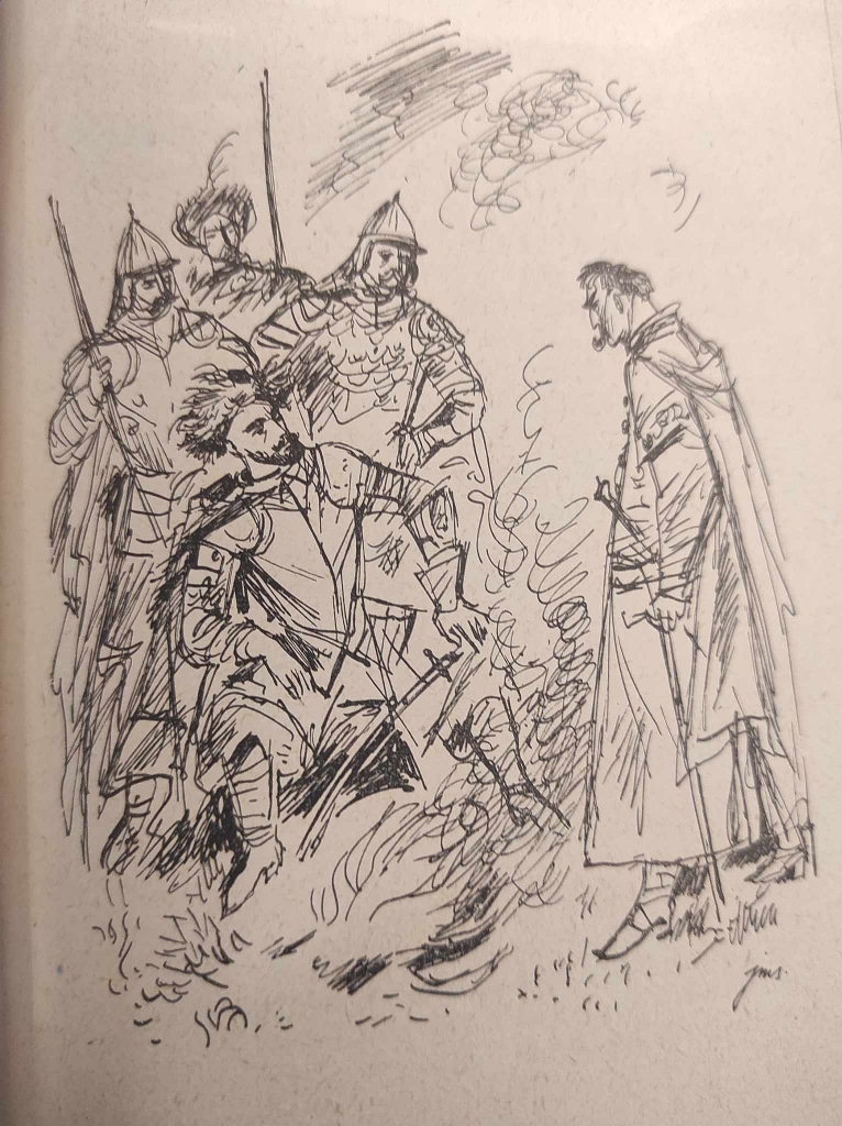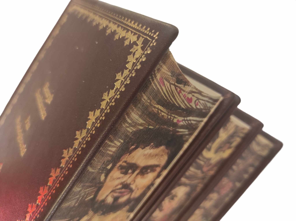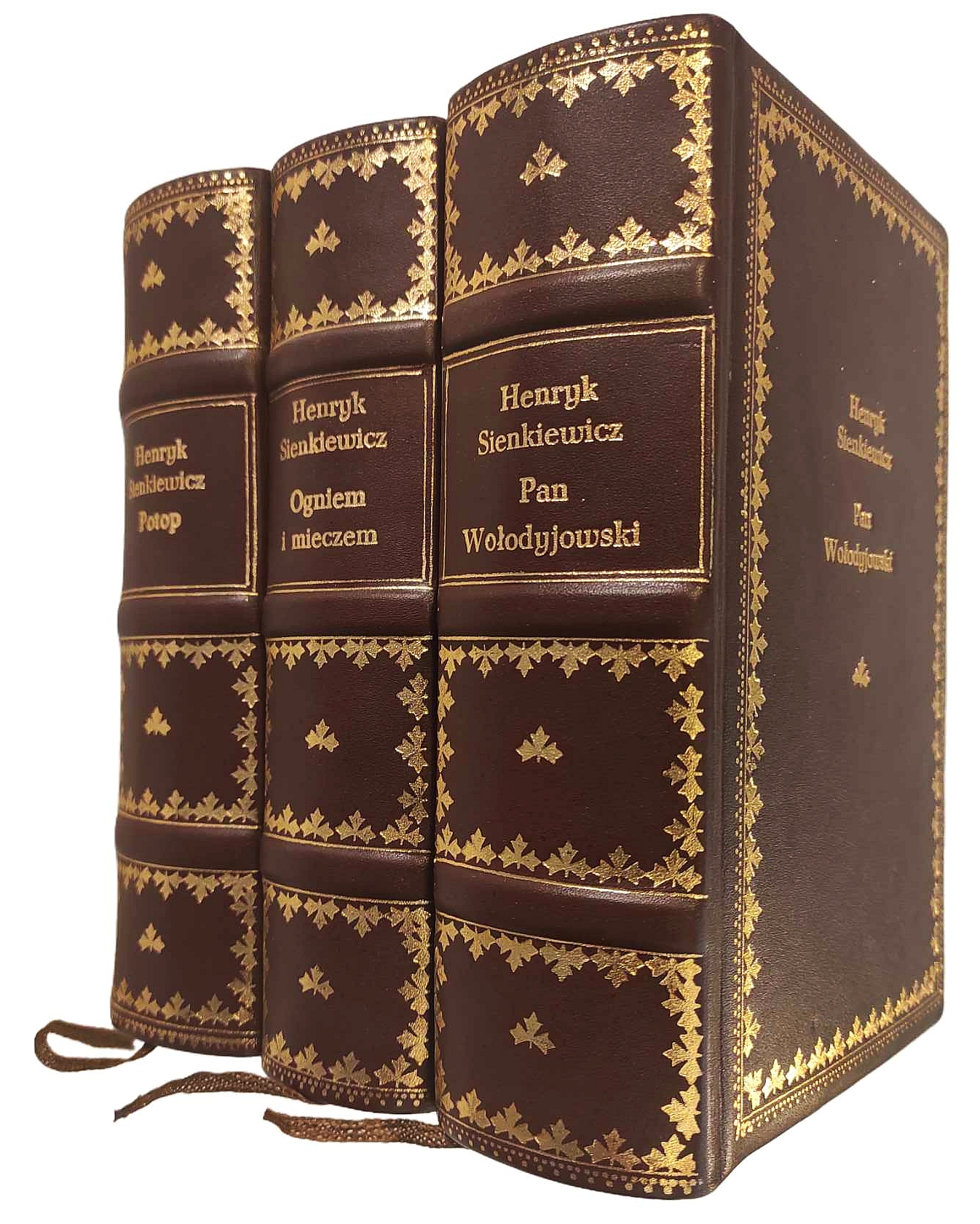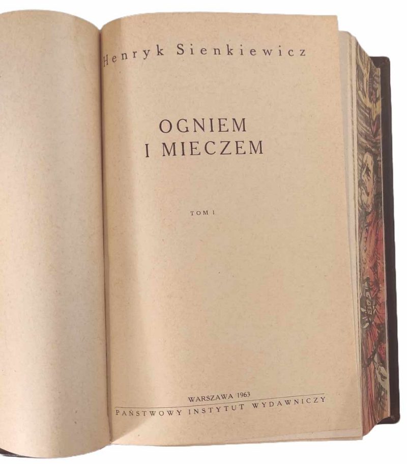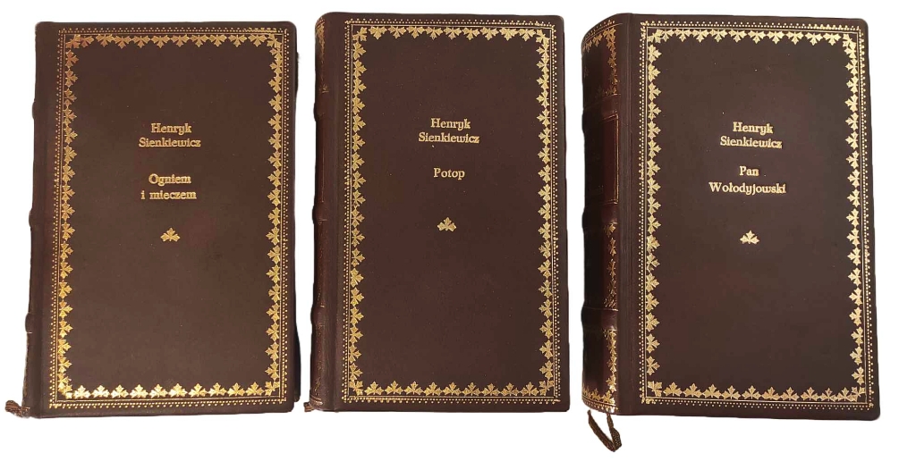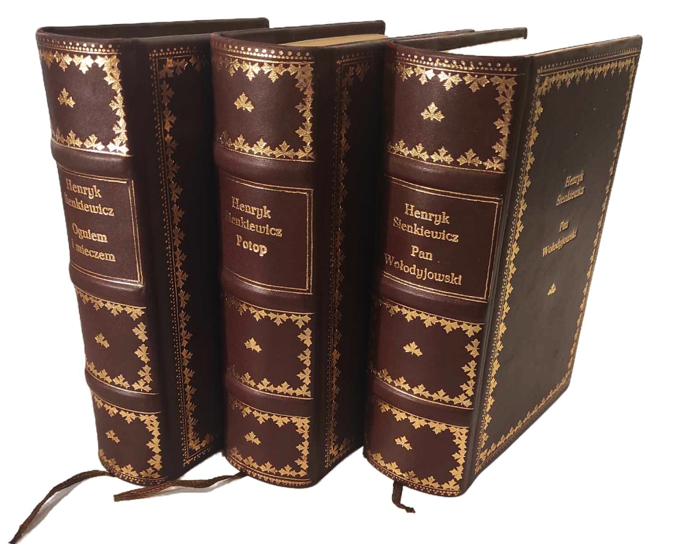 Henryk Sienkiewicz, Trylogia – Ogniem i mieczem, Potop, Pan Wołodyjowski [oprawa artystyczna] [prezent] [oprawa luksusowa] [Jan Marcin Szancer] [ilustracje], Sześć tomów Trylogii oprawne w 3 woluminach – komplet wydawniczy, Warszawa 1963, Państwowy Instytut Wydawniczy, 464, 451; 474, 587; 424, 624 s., Ilustracje: Jan Marcin Szancer Luksusowe oprawy artystyczna wykonana w pracowni Kurtiak i Ley Wydawnictwo artystyczne, pełnoskórzane z bindami, złocone na licu i grzbiecie, obcięcia kart z ręcznie malowanymi postaciami – bohaterami utworu s. bdb, 1 karta tekstu w starannej kopii For. ca: 19,5×12,5 cm