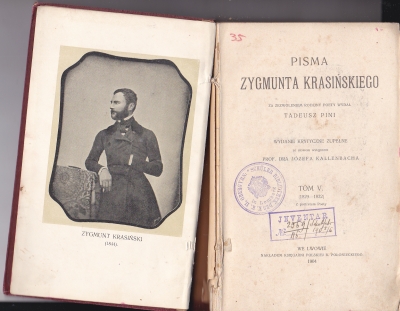Krasiński Zygmunt, Pisma tom V (1828-1832), Lwów 1904, Nakładem Księgarni Polskiej B. Połonieckiego, o, płócienna ze złoceniami, górny blok złocony, s. 326, zaplamienia, przetarcia oprawy, odspojenie od przedniej oprawy, pieczęć własnościowa, brak fr. wyklejki