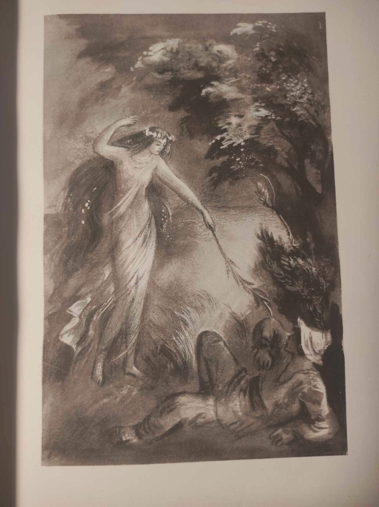 Słowacki Juliusz, Dramaty [oprawa artystyczna] [oprawa luksusowa] [prezent] [Jan Marcin Szancer] [ilustracje], Warszawa 1955, Państwowy Instytut Wydawniczy, 513, [3] s., oprawa luksusowa pełnoskórzana z bindami, ze złoconą tytulaturą na licu i grzbiecie, ozdobną bordiura na licu i odwrocie oraz zdobionym grzbietem sygnowana wlepką na wyklejce: Kurtiak i Ley, obcięcie kart ręcznie malowane, dedykacja na stronie przed przed tytułowej – dołączonej przez introligatora na odmiennym papierze – nie będąca oryginalną częścią książki, bardzo dobry stan zachowania.