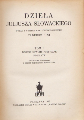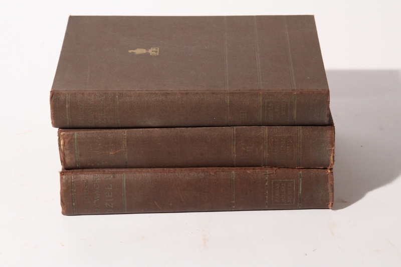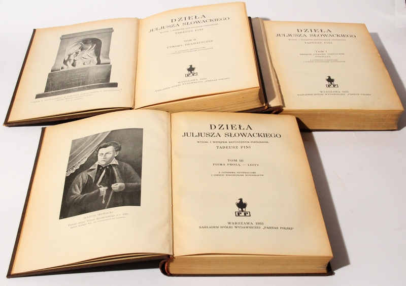 Słowacki Juliusz, Dzieła Juljusza Słowackiego 1-3 t., Nakładem Spółki Wydawniczej Parnas Polski, Warszawa 1933, oprac. Tadeusz Pini, 480+490+440 s., podpis w każdym z tomów, w tomie 1 luźna pierwsza karta oraz grzbiet częściowo odspojony od grzbietu, o. tw., w tomie 2 uszk. grzbiet