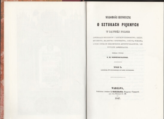 Sobieszczański F.M. Wiadomości historyczne o sztukach pięknych w dawnej Polsce zawierające opis dziejów i zabytków budownictwa, rzeźby, snycerstwa, malarstwa i rytownictwa, z krótka wzmianką o życiu i dziełach znakomitych artystów krajowych, lub w Polsce zamieszkałych Tom I, II 210439.