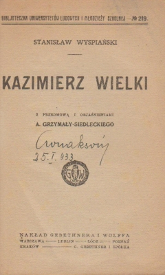 Wyspiański Stanisław, Kazimierz Wielki, Nakład Gebethnera i Wolffa, Warszawa, 60 s., anulowane pieczątki bibliot., podpis pryw., o. tw. int.współczesna, wewnątrz zachowana oryg. okładka broszurowa, s. bdb