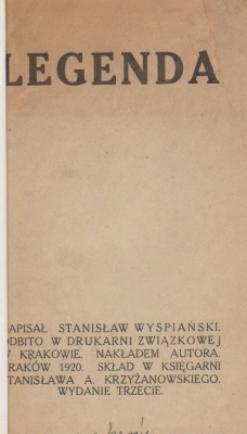 Wyspiański Stanisław, Legenda, Odbito w Drukarni Związkowej, Kraków 1920, 120 s., anulowane pieczątki bibliot., o. współczesna tw. int., s. bdb
