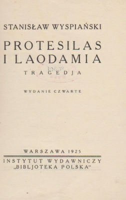 Wyspiański Stanisław, Protesilas i Laodamia, Instytut Wydawniczy Bibljoteka Polska, Warszawa 1925, 60 s., zaplamiona okładka, grzbiet wzmocniony taśmą, anulowane pieczątki bibliot.